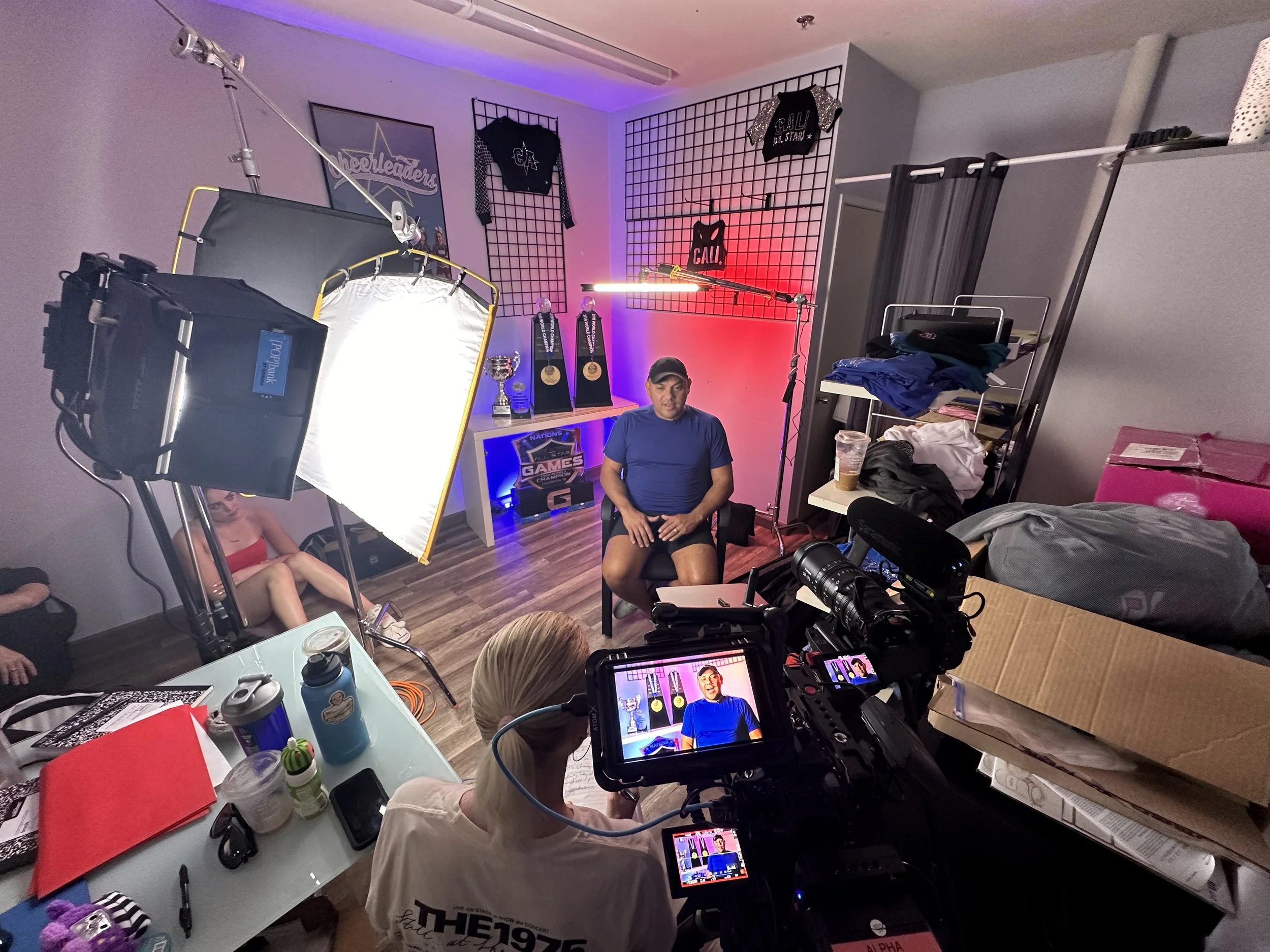 While it was a bit of a tight space, we made it work for our interviews. Originally, the show had velvet blue curtain as its backdrop for its interviews. Since then, I’ve filmed countless interviews and wanted to bring in more depth, and more life to the image. And so we went with a bolder look. Because budgets and delivery date were tight, I opted to film with two Fujifilm X-H2S’s using Fujifilm’s Velvia/Vivid film simulation baked into the image. I love the way the colors popped, and the warmth it gave the skin tones. It had that rich feeling my director and I had wanted, and so the look was established and the first episode was in the can.